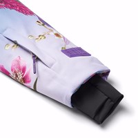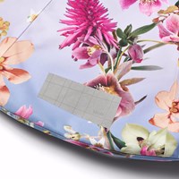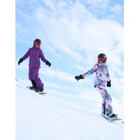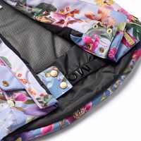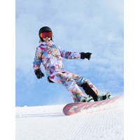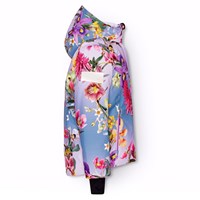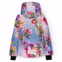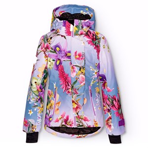 Vind- och vattentät skidjacka i återvunnen polyester med ett tryck av vackra blommor i fräscha färger på en blå och lila bakgrund. Den har en avtagbar fodrad huva och en dragkedja med överlappande flik för att hålla vinden ute. Jackan har stora reflexer för att öka synligheten i trafiken. Den har även fodrade fickor med dragkedja, en ficka på ärmen för liftkort och en innerficka. Jackan har också ett vindskydd runt midjan och ärmslut med tumhål för att hålla ute snö, vind och vatten. Den är fodrad med fleece och 3M™ Thinsulate™, vilket ger större rörlighet för barnet.