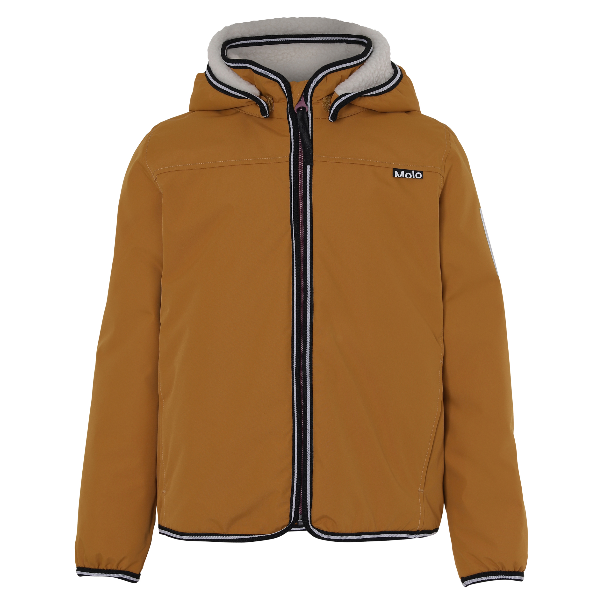 Snygg, senapsgul fodrad regnjacka med avtagbar huva, dragkedja framtill, fickor på sidan samt Molos välkända stjärnreflex på ena ärmen samt på ryggen. Jackan är tillverkad i ett vindtätt, vattentåligt och andningsbart material. Jackan har en fleecefodrad huva och fleecefodrad rygg, samt tejpade sömmar. Denna produkt har en vattentät PFC-fri impregnering (innehåller till exempel inte PFOS, PFOA och liknande). Vattenpelare: 5 000 mm. Andningsförmåga: 5 000 g / m2 / 24 timmar.