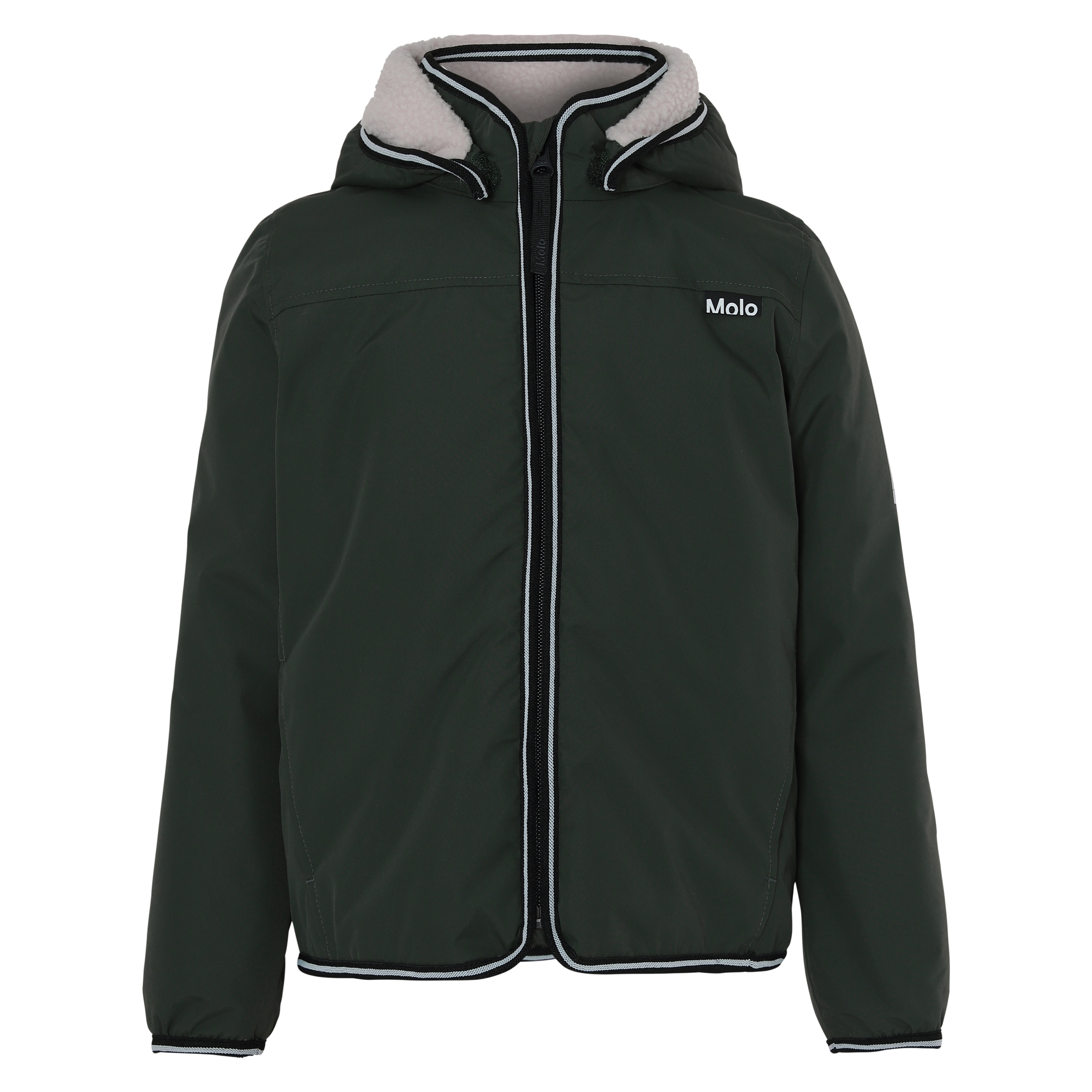 Snygg, mörkgrön fodrad regnjacka med avtagbar huva, dragkedja framtill, fickor på sidan samt Molos välkända stjärnreflex på ena ärmen samt på ryggen. Jackan är tillverkad i ett vindtätt, vattentåligt och andningsbart material. Jackan har en fleecefodrad huva och fleecefodrad rygg, samt tejpade sömmar. Denna produkt har en vattentät PFC-fri impregnering (innehåller till exempel inte PFOS, PFOA och liknande). Vattenpelare: 5 000 mm. Andningsförmåga: 5 000 g / m2 / 24 timmar.