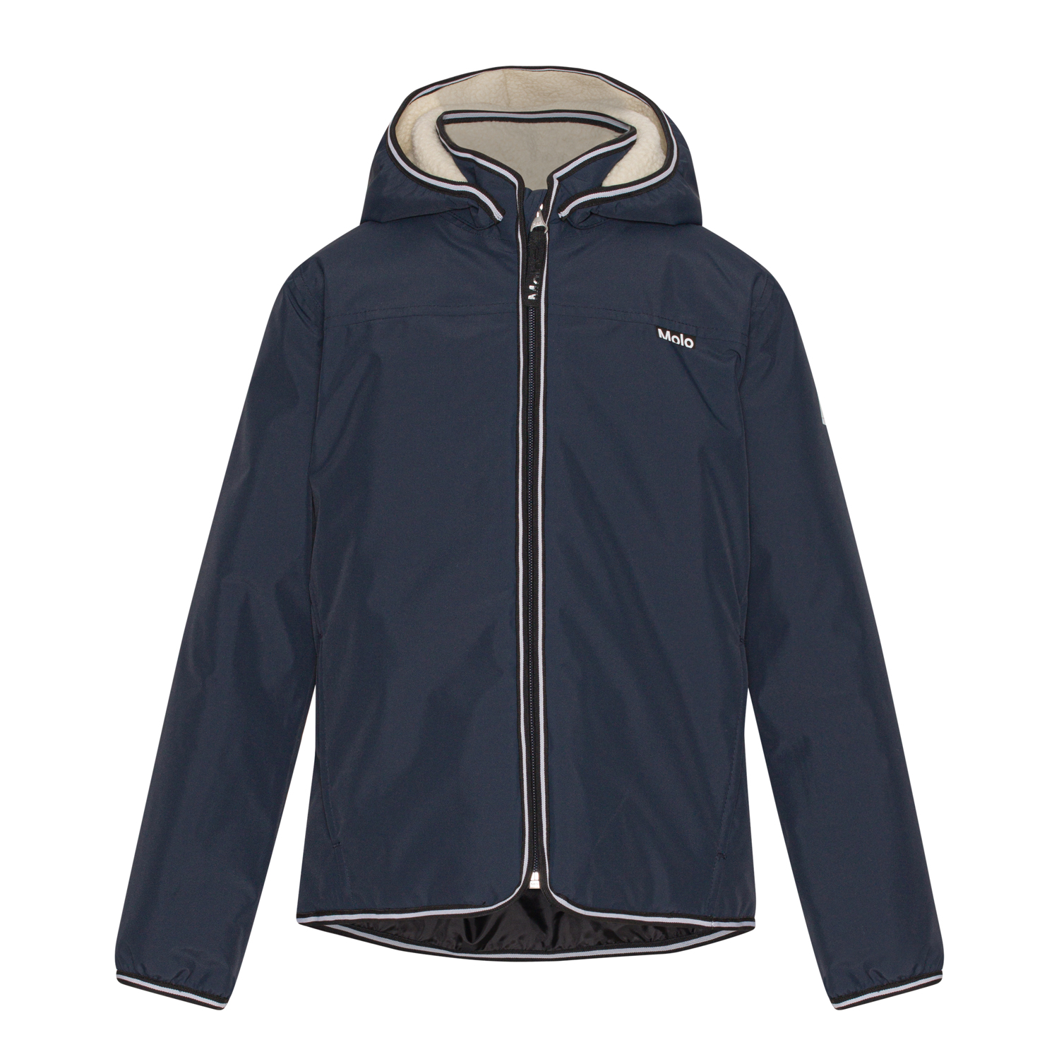 Vattentät jacka i mörkblå med tejpade sömmar och fodring som gör den mycket lämplig som regnkläder under kalla höst- och vintermånader. Jackan kan även användas som vardagsklädsel under övergångsperioderna när vädret kan vara väldigt omväxlande. Jackan har blixtlås framtill, en avtagbar fleece huva, fickor på sidorna samt reflexer baktill och på ena ärmen. Vattentäthet: 5 000 mm. Andningsförmåga: 5 000 g/m²/24t.