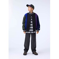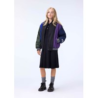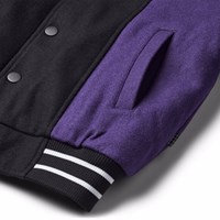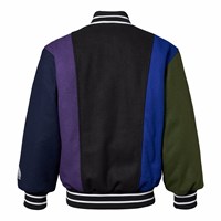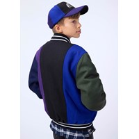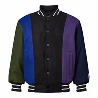 Basebolljacka i svart, blå, grön och lila färger gjord av en robust ullblandning. Jackan har knäppning med knappar framtill, påsydda framfickor samt randiga ribbade kanter vid halsen, ärmsluten och nederkanten. Jackan har en lös passform som ger plats för en extra tröja under.
