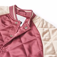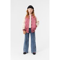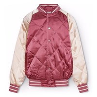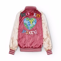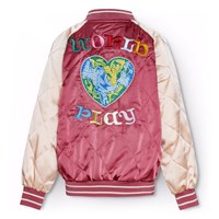 Vadderad bomberjacka i vinrött och off-white med en broderad ryggpatch. Jackan har randig ribbkant vid halsen, ärmsluten och midjan, framfickor och tryckknappar. Broderiet är ett hjärta med en jordglob inuti och texten "World Play". World Play handlar om hur lek inte bara är roligt utan också ett viktigt sätt att lära och växa. Lek stärker våra sociala färdigheter, empati och hjärnfunktion, och ger en känsla av lycka, oavsett ålder. Kom ihåg att leka mycket mer.