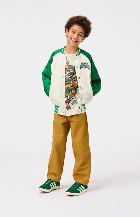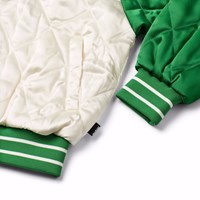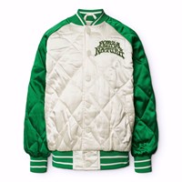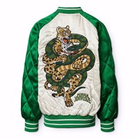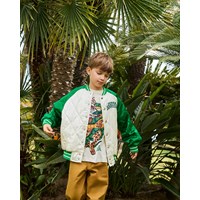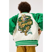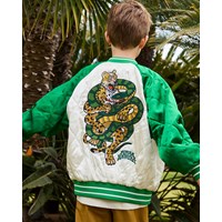 Quiltad bomberjacka i grönt och off-white med en broderad ryggpatch av en gepard och orm i levande färger och texten 'Forza Della Natura' på bröstet. Bomberjackan har randiga ribbade kanter vid halsen, ärmsluten och nederkanten, samt fickor framtill och tryckknappar framtill.