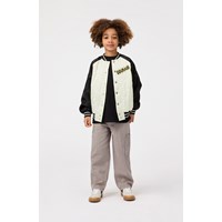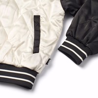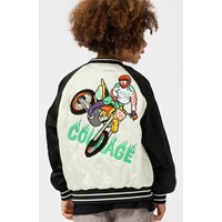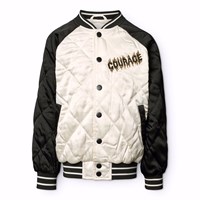 Quiltad bomberjacka i svart och off-white med en broderad ryggpatch av en motocrossförare och texten 'Courage'. Bomberjackan har randiga ribbade kanter vid halsen, ärmsluten och midjan, samt fickor framtill och tryckknappar framtill.