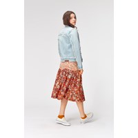 Hattie är en ljusblå jeansjacka med fransdetaljer och knappar framtill.