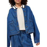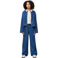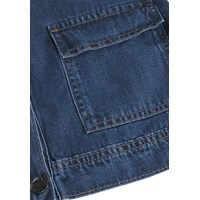 Blå klassisk denimjacka i mjuk viskos- och bomullsblandning i en lös passform. Jackan har stora framfickor med lock, knäppning framtill och en liten läderetikett med logotyp på baksidan. En mångsidig och tidlös stil för vardagsbruk. De minsta storlekarna (92–134) har tryckknappar, medan storlekarna 140–176 har en klassisk jeansknapp.