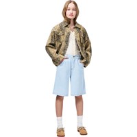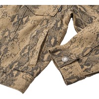 Brun denimjacka i bomull med ormmönster. Jackan har en lös passform, skjortkrage, knäppning fram, sidfickor, bröstfickor och justerbara tryckknappar bak. Från storlek 92-134 levereras jackan med tryckknappar, vilket gör det lättare för barn att stänga jackan själva. Från storlek 140-176 levereras jackan med vanlig knäppning.