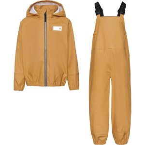 Wade er et regntøjssæt, som består af en regnjakke og et par regnoveralls i en flot honningfarve. Regnjakken har aftagelig hætte og lynlåslukning på fronten. Regnbukserne har justerbare seler og elastisk benafslutning. Både regnjakken og bukserne har Molo's velkendte refleks stjerne på bagsiden. Dette produkt har en vandafvisende PFC-fri imprægnering (indeholder f.eks. ikke PFOS, PFOA og lignende). Vandsøjletryk: 8.000 mm.