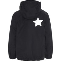 Waiton är en lätt och funktionell regnjacka i svart. Waiton har dold dragkedja, som skyddar mot väder och vind, tejpade sömmar, avtagbar huva och två fickor fram. Jackan har Molo's ikoniska stjärnreflex bak för ökad synlighet i mörker. Produkten har en vattenavvisande PFC-fri impregnering (innehåller ej PFOS, PFOA eller liknande). Vattenpelare: 5.000 mm. Andningsförmåga: 5.000 g/m2/24t