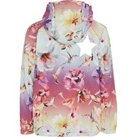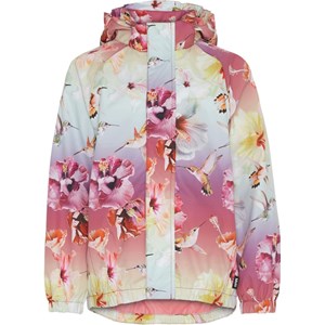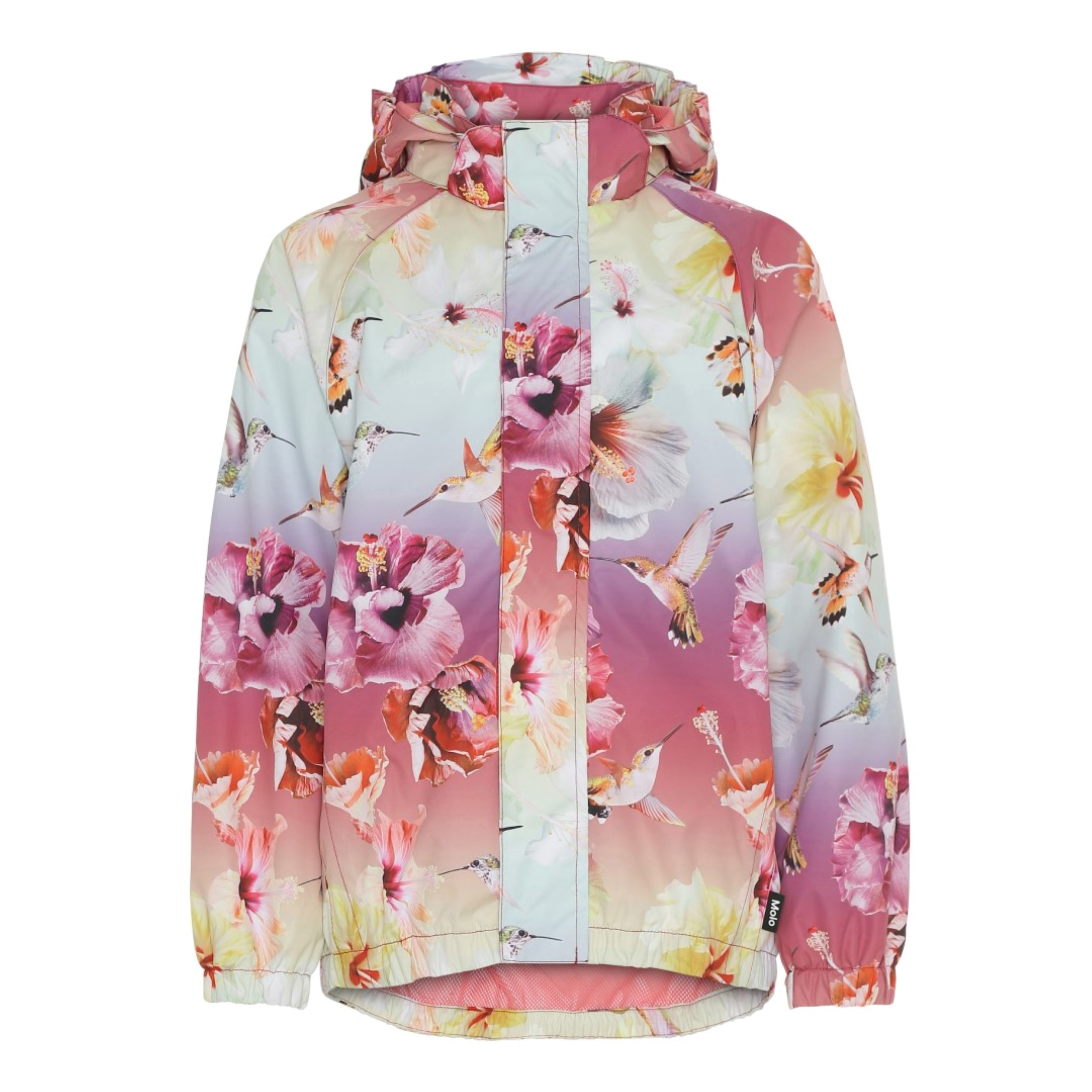 Waiton är en lätt och funktionell regnjacka med all-over tryck av blommor och kolibrier i snygga färger. Waiton har dold dragkedja, som skyddar mot väder och vind, tejpade sömmar, avtagbar huva och två fickor fram. Jackan har Molo's ikoniska stjärnreflex bak för ökad synlighet i mörker. Produkten har en vattenavvisande PFC-fri impregnering (innehåller ej PFOS, PFOA eller liknande). Vattenpelare: 5.000 mm. Andningsförmåga: 5.000 g/m2/24t