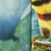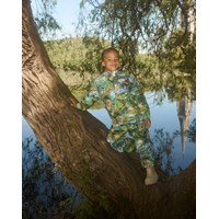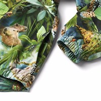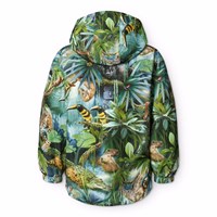 Grön vind- och vattentät regnjacka i återvunnen polyester. Den har en avtagbar huva och ett mönster av en djungel och dess färgglada djur. Jackan har en normal passform, sidofickor, elastiska ärmslut och nederkant, vattentäta sömmar och en dragkedja med hakskydd och stormklaff för att hålla ute vädret.
