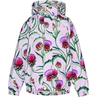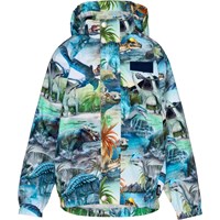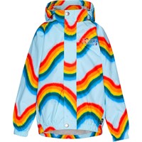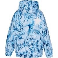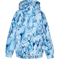 Ljusblå regnjacka med handskissade hästar. Jackan är i ett lätt material som andas och förhindrar att där samlas kondens och fukt på insidan, även under hög aktivitet. Jackan har avtagbar luva, två fickor framtill, gummiband i ärmslut och nertill samt en dold dragkedja som skyddar mot vind och regn. På baksidan har jackan en stor stjärnreflex som ökar synligheten i trafiken. Samtliga sömmar är tejpade för att förhindra läckage. Vattenpelare: 5.000 mm. Andningsförmåga: 5.000 g/m2/24t.