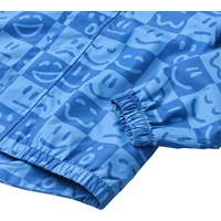Vind- och vattentät regnrock tillverkad av återvunnen polyester. Rocken är i blå nyanser med ett rutigt tryck av olika emojis. Den har en avtagbar huva, täckt dragkedja med hakskydd, dolda sidofickor, elastiska muddar och resår i nederkant.