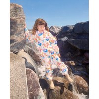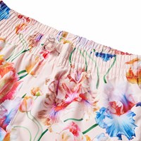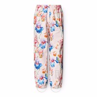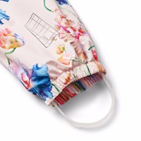 Ljusblå vind- och vattentäta regnbyxor i återvunnen polyester med ett färgglatt mönster av konstnärliga tulpaner. Byxorna har en vanlig passform, en justerbar elastisk midja, avtagbara och justerbara gummiband med Molo-logotypen, och en reflex längst ner på benet. Sömmarna är vattentäta, vilket säkerställer att vind och vatten hålls ute.