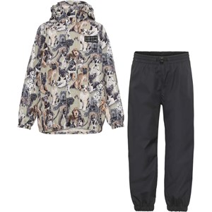 Whalley är ett lätt och funktionellt regnställ med jacka i khaki med hundmönster och svarta byxor. Regnjackan har en övertäckt dragkedja, som beskyddarmot vind och regn, tejpade sömmar, avtagbar luva och två fickor fram. Regnbyxorna har tejpade sömmar, gummiband vid benslut och i midjan som kan justeras. Både jackan och byxorna har Molo´s välkända reflexstjärna baktill. En stor fördel med dessa regnplagg är att det andas, så hög aktivitet inte resulterar i en fuktig innersida. Denna produkt har en vattenavvisande PFC-fri impregnering (innehåller t.ex. inte PFOS, PFOA och liknande). Vattenpelare: 5.000mm. Andningsförmåga: 5.000 g/m2/24t.