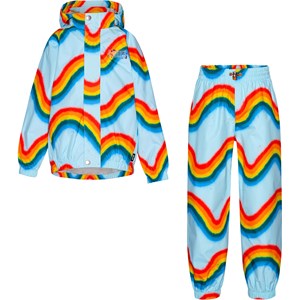 Ljusblått regnställ med färgrika regnbågar i ett lätt material som andas och förhindrar att där samlas kondens och fukt på insidan, även under hög aktivitet. Jackan har avtagbar luva, två fickor framtill, gummiband i ärmslut och nertill samt en dold dragkedja som skyddar mot vind och regn. Regnbyxorna har justerbart gummiband i midjan och gummiband vid bensluten. På det ena benet är där en stor stjärnreflex för extra synlighet i trafiken. På baksidan har både jackan och byxorna en stor stjärnreflex som ökar synligheten i trafiken. Samtliga sömmar är tejpade för att förhindra läckageSamtliga sömmar är tejpade för att förhindra läckage. Vattenpelare: 5.000 mm. Andningsförmåga: 5.000 g/m2/24t.