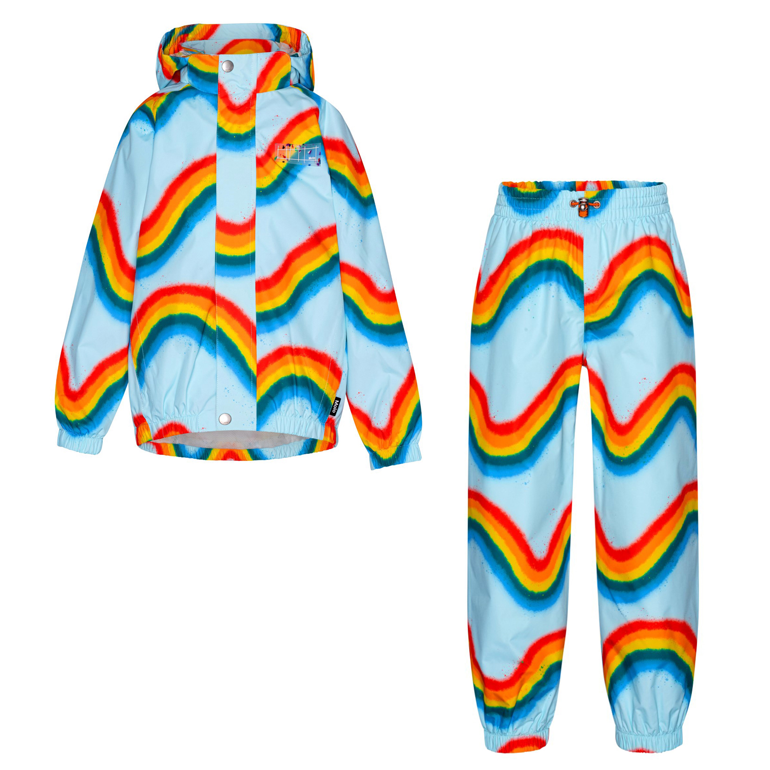 Ljusblått regnställ med färgrika regnbågar i ett lätt material som andas och förhindrar att där samlas kondens och fukt på insidan, även under hög aktivitet. Jackan har avtagbar luva, två fickor framtill, gummiband i ärmslut och nertill samt en dold dragkedja som skyddar mot vind och regn. Regnbyxorna har justerbart gummiband i midjan och gummiband vid bensluten. På det ena benet är där en stor stjärnreflex för extra synlighet i trafiken. På baksidan har både jackan och byxorna en stor stjärnreflex som ökar synligheten i trafiken. Samtliga sömmar är tejpade för att förhindra läckageSamtliga sömmar är tejpade för att förhindra läckage. Vattenpelare: 5.000 mm. Andningsförmåga: 5.000 g/m2/24t.