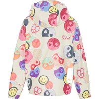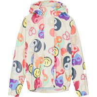 Regnjacka i gummi med färgrikt mönster av smileys, hjärtan, peacetecken och yin-yang symboler. Jackan har avtagbar luva, två fickor fram, gummiband vid ärmslut och nertill samt en täckt dragkedja som skyddar mot vind och regn. På baksidan har jackan en stor reflex som ökar synligheten i trafiken. Samtliga sömmar är tejpade för att förhindra att vatten läcker igenom. Insidan är tillverkad av återvunnen polyester. Med en hög vattenpelare på 8.000 mm är regnkläder i gummi särskilt lämpliga till stora regnskurar och många timmars lek i regnet. Gummi är särskilt slitstarkt och är därför ideelt till mindre barn, så att de både kan åka rutschkana och glida på rumpan, utan att regnkläderna tar skada.