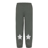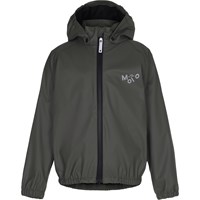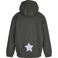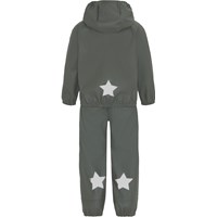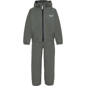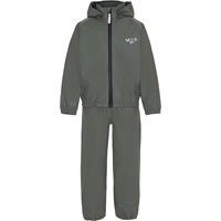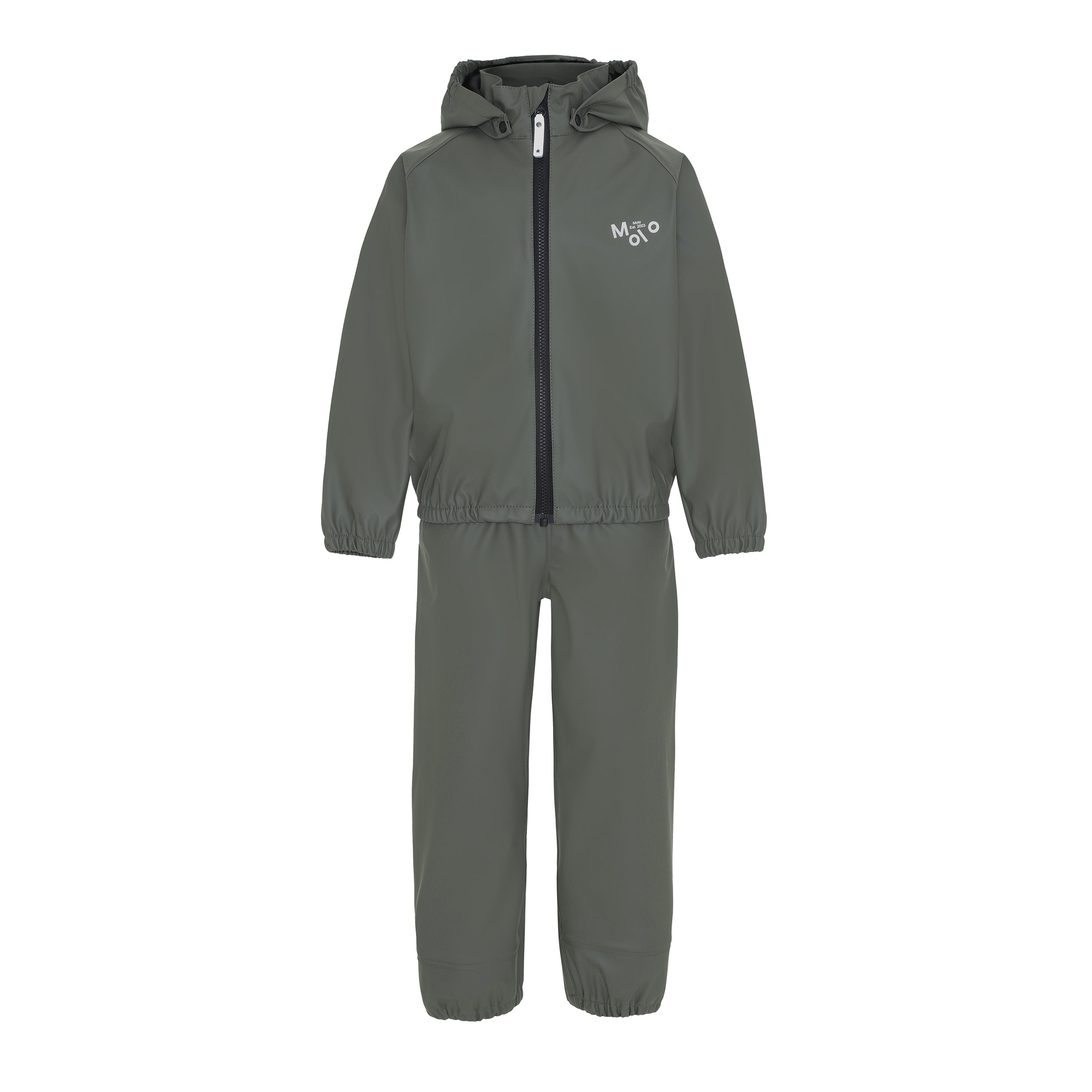 Zet är en lätt och funktionell regnställ i mörkgrön. Regnjackan har avtagbar huva, dragkedja fram och resår vid kanten av huvan, ärmar samt i nederkanten av jackan. Regnbyxorna har resår i midjan och benslut samt avtagbara fothällor. Både jacka och byxor har tejpade sömmar och har Molo's karakteristiska reflexstjärnor för ökad synlighet i mörker. Produkten har en vattenavvisande PFC-fri impregnering (innehåller ej PFOS, PFOA eller liknande). Vattenpelare: 5.000 mm
