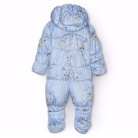 Vattenavvisande, ljusblå overall för baby med vattenfärgsmålade kattansikten i återvunnen polyester. Overallen är lämplig som en vagnoverall för kallare dagar. Den har två dragkedjor framtill, vilket gör den enkel att ta på och av. Dessutom har den en avtagbar huva och avtagbara fötter som kan knäppas på och av. Den har också en fleecefodring och elastik i ärm- och bensluten, vilket håller vantar, strumpoe och stövlar på plats och skyddar mot vind och väder.