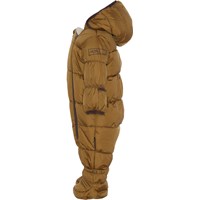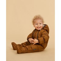 Hebe er en varm baby flyverdragt eller barnevognsdragt i brun. Flyverdragten har aftagelig hætte, to lynlåse som gør det nemt at få dragten af og på, samt aftagelige futter og ærmer der kan trækkes ud til vanter. Flyverdragten er lavet i et vindtæt, vandtæt og åndbart materiale, men uden tapede sømme. Hebe er foret med teknisk dun, kaldet pearl padding, som giver ekstra blødhed, holder godt på varmen og har en dunlignende følelse. Dette produkt har en vandafvisende PFC-fri imprægnering (indeholder f.eks. ikke PFOS, PFOA og lignende). Vandsøjletryk: 5.000 mm. Åndbarhed: 5.000 g/m2/24t.