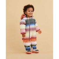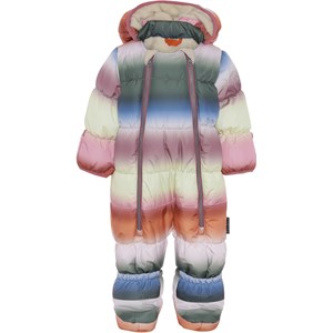 Hebe er en varm baby flyverdragt eller barnevognsdragt i pastel farvede regnbue print. Flyverdragten har aftagelig hætte, to lynlåse som gør det nemt at få dragten af og på, samt aftagelige futter og ærmer der kan trækkes ud til vanter. Flyverdragten er lavet i et vindtæt, vandtæt og åndbart materiale, men uden tapede sømme. Hebe er foret med teknisk dun, kaldet pearl padding, som giver ekstra blødhed, holder godt på varmen og har en dunlignende følelse. Dette produkt har en vandafvisende PFC-fri imprægnering (indeholder f.eks. ikke PFOS, PFOA og lignende). Vandsøjletryk: 5.000 mm. Åndbarhed: 5.000 g/m2/24t.