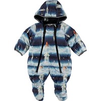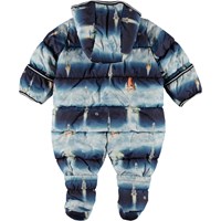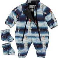 Hebe är en varm baby overall eller barnvagnsdräkt med i Molo's tryck 'Stratosphere'. Overallen har avtagbar huva, två dragkedjor, som gör dräkten lätt att ta av och på, samt avtagbara fothällor och ärmar som kan dras ut till vantar. Overallen är vind- och vattentät och har bra andningsförmåga, med 3M™ Thinsulate™ foder, men utan tejpade sömmar. Produkten har en vattenavvisande PFC-fri impregnering (innehåller ej PFOS, PFOA eller liknande).