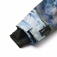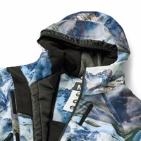 Vind- och vattentät overall med ett vackert landskapsmönster som visar snötäckta bergstoppar i levande färger tillverkad av återvunnen polyester. Overallen har en avtagbar fodrad huva med en extra elastisk kant för att hålla den på plats på huvudet, samt en dragkedja framtill med en stormklaff för att hålla ute vind och vatten. Overallen har resår i midjan och vind- och snölås vid ärmslut och benslut för att hålla ute snö, regn och vind. Dessutom har overallen extra justering vid benslutet och använder ett hållbart material på insidan. Detta säkerställer att overallen passar perfekt över skidstövlar eller vinterstövlar och förlänger även livslängden. Overallen är utrustad med en reflextext på benet för synlighet i trafiken. Dessutom är overallen fodrad med återvunnen polyesterfleece på utsatta områden och vadderad med 3M™ Thinsulate™ för att hjälpa till att behålla värmen. Overallen har framfickor, en innerficka och en liten ficka på ärmen för liftkort, alla med vattentäta dragkedjor.