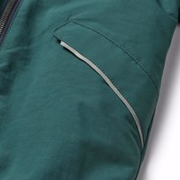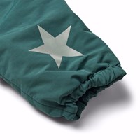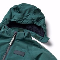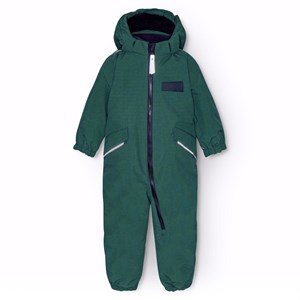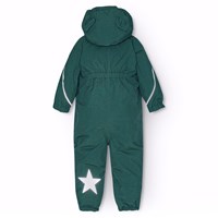 Mörkgrön varm overall för baby och småbarn i återvunnen polyester. Overallen har en avtagbar fodrad huva och en extra lång och vattentät dragkedja framtill för att göra den lätt att ta på. Overallen har resår i midjan, ärmslut och benslut för att hålla snö, regn och vind ute och för att hålla vantar och stövlar påplats. Overallen har reflexer på fickorna och ärmarna samt en stor stjärnformad reflex på benet för att öka synligheten i trafiken. Overallen har fodrade framfickor och en justerbar inre resår i midjan för bra form och passform runt kroppen.