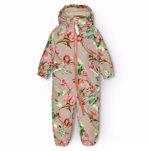 Varm overall för baby och småbarn i återvunnen polyester med julrosor i vita och rosa nyanser, som vackert grenas samman i sina gröna blad på moccafärgad bakgrund. Overallen har en avtagbar fodrad huva och en extra lång och vattentät dragkedja framtill för att göra den lätt att ta på. Overallen har resår i midjan, ärmslut och benslut för att hålla snö, regn och vind ute och för att hålla vantar och stövlar påplats. Overallen har reflexer på fickorna och ärmarna samt en stor stjärnformad reflex på benet för att öka synligheten i trafiken. Overallen har fodrade framfickor och en justerbar inre resår i midjan för bra form och passform runt kroppen.