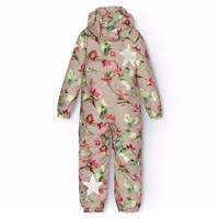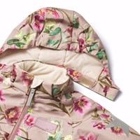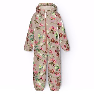 Overall i återvunnen polyester för en kall vinter med hästar på en vacker lila skogsmark mellan två stora ekar med löv i blåa och lila nyanser. Overallen har en avtagbar fodrad huva och en vattentät dragkedja framtill för att hålla vind och vatten ute. Den har elastik i midjan, ärmarna och benen för att hålla vantar och stövlar på plats. Overallen har reflexer längs sidorna och stora stjärnformade reflexer på ärmarna, benen och baksidan för att öka synligheten i trafiken. Den har fodrade sidofickor och ett justerbart gummiband på insidan för bra form och passform runt kroppen.