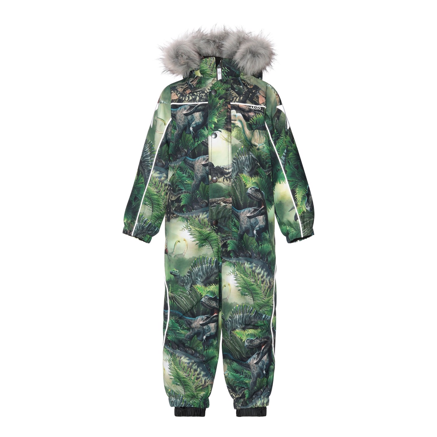 Polaris Fur er en af Molo's favoritter, når det er rigtig koldt. Polaris er en funktionel flyverdragt i grøn med print af dinosaur. Polaris er perfekt både til de ekstrem kolde og almindelige vintre, grundet dets utrolig høje åndbarhed samt isolering. Den høje åndbarhed er med til at hjælpe kropstemperaturen regulere sig og sørge for, at dit barn hverken bliver for kold eller varm. På varmere vinterdage kan barnet derfor nøjes med tynde lag under og på dage med voldsomme tocifrede minusgrader kan man supplere med et ekstra lag indenunder. Har du er stillesiddende barn vil Polaris også være et oplagt valg. Flyverdragten har desuden refleks pipings og en faux furpels krave (kan tages af). Polaris har aftagelig hætte, lynlås ned langs fronten med overfald, Molo's velkendte stjernereflekser på arme og ben, snefang i benåbning, samt gummistrop under foden. Polaris er foruden dens mange velkendte kvaliteter nu også delvist recycled. Ydermaterialet er fremstillet af 45% recycled polyester, 3M™ Thinsulate™ foret er fremstillet af 83% recycled polyester og inderstoffet af 100% recycled polyester. Flyverdragten er lavet i et vindtæt, vandtæt og åndbart materiale og har tapede sømme. Dette produkt har en vandafvisende PFC-fri imprægnering (indeholder f.eks. ikke PFOS, PFOA og lignende) og har på baggrund af dette vundet 'Bedst-i-Test'. Vandsøjletrykket og åndbarheden er yderligere forbedret og er nu helt oppe på 15.000 mm i vandsøjletryk og åndbarhed på 15.000 g/m2/24t.