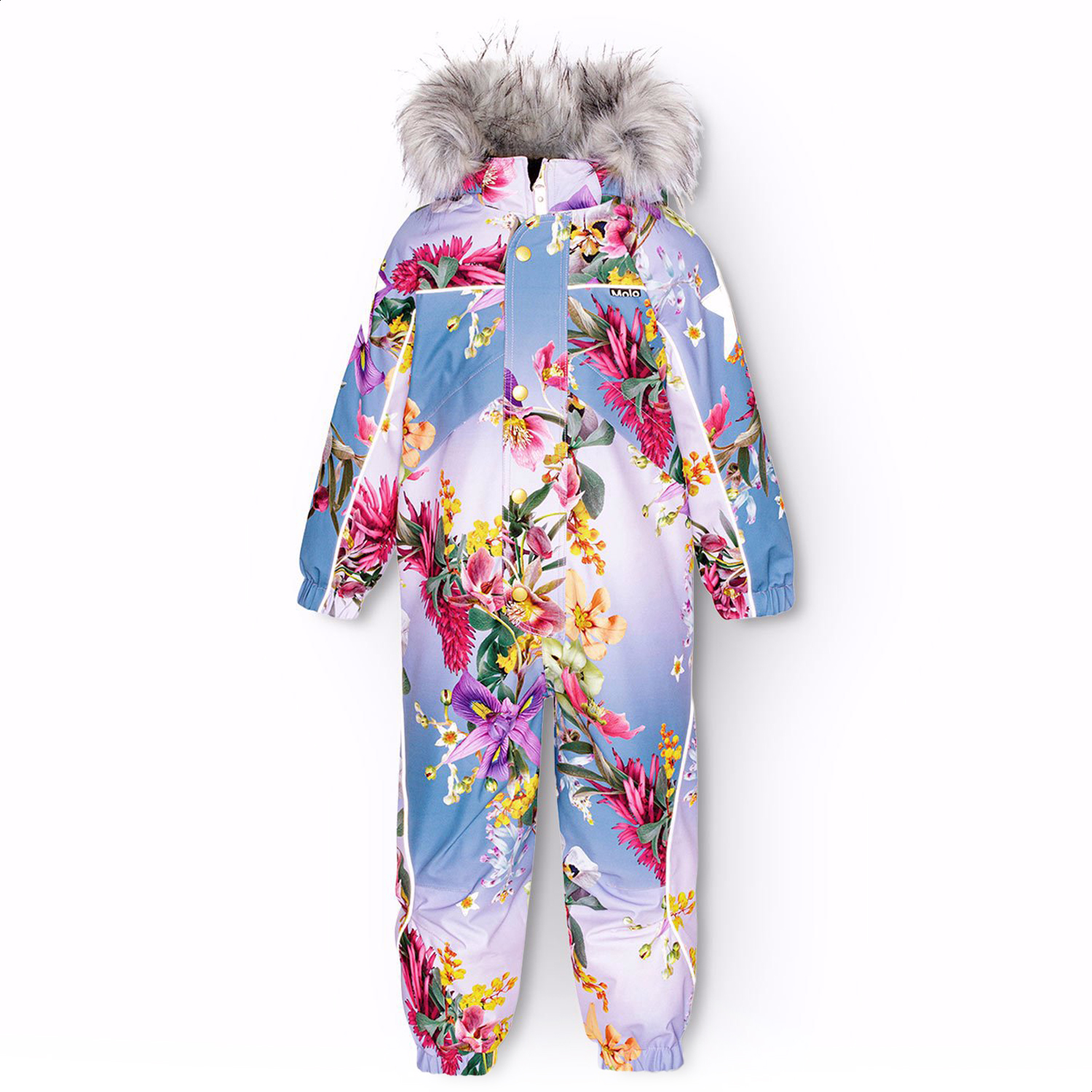 Overall i återvunnen polyester för en kall vinter med ett tryck av vackra blommor i fräscha färger på en blå och lila bakgrund. Overallen har en avtagbar fodrad huva och en dragkedja med överlappande flik för att hålla ute vind och vatten. Det finns elastik i midjan, ärmarna och bensluten för att hålla ute snö, regn och vind. Overallen har reflexband längs sidorna, runt huvan och stora stjärnformade reflexer på både ärmarna och benen för att öka synligheten i trafiken. Overallen är fodrad med 3M™ Thinsulate™, vilket ger barnet större rörlighet, och har fodrade framfickor med vattentäta dragkedjor.