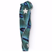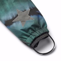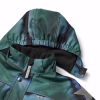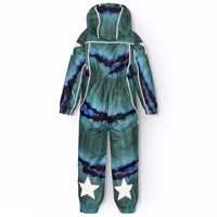 Grön och blå tie-dye overall i återvunnen polyester för en kall vinter. Overallen har en avtagbar fodrad huva och dragkedja med överlappande flik för att hålla vind och vatten ute. Den har elastik i midjan, ärmarna och benen för att hålla snö, regn och vind ute. Overallen är utrustad med reflexer längs sidorna, runt huvan och stora stjärnformade reflexer på både ärmarna och benen för att öka synligheten i trafiken. Overallen är fodrad med 3M™ Thinsulate™, vilket gör den lätt och ger större rörlighet för barnet. Det finns också fodrade framfickor med vattentäta dragkedjor. Observera att all vår tie-dye är handgjord, vilket skapar ett unikt mönster som varierar från plagg tillplagg.