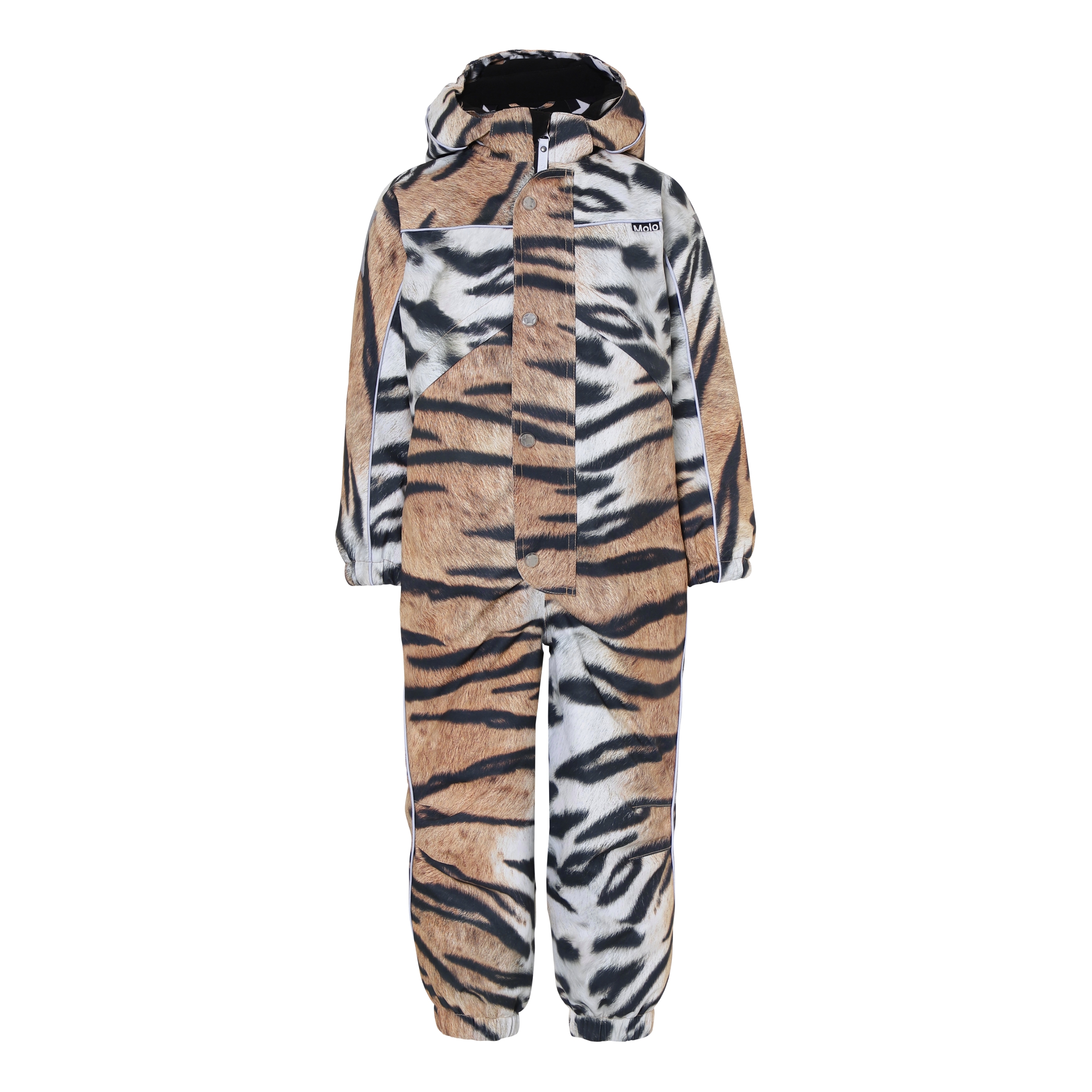 Funktionell vind- och vattentät overall i tigermönster. Overallen har blixtlås, avtagbar hätta, snölås i benen, gummirem under foten samt nylonfoder i det yttersta lagret vid armar och ben för att göra den lätt att ta av och sätta på. Därutöver har overallen invändig fleece på rygg, bakdel, knä och hals. Avtagbar hätta, snölås i benen samt Molos karaktäristiska stjärnreflexer och reflexpiping, som säkrar att barnet syns på långt avstånd i mörkret. Overallen lever också upp till EU’s säkerhetsstandard DS/EN 14682 och är fodrad med 3M™ Thinsulate™, vilket gör den särskilt varm och tillåter kroppen att andas, samtidigt som den förblir mjuk och lätt. Den här produkten har en PFC-fri vattenavvisande impregnering (innehåller inte PFOS, PFOA eller liknande). Med bakgrund i detta har Polaris vunnit 'Bäst-i-Test'. Vattenpelare: 15.000 mm. Andas: 15.000 g/m2/24hr.