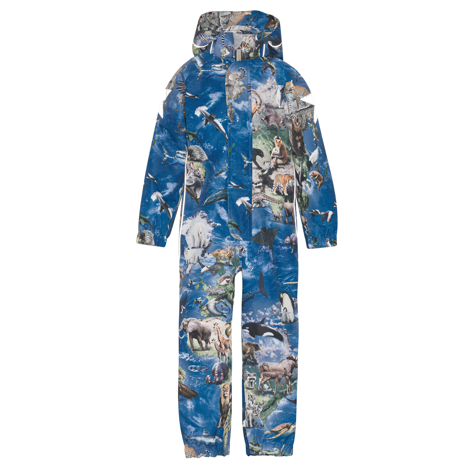Polly er en funktionel flyverdragt, her i en let og uforet udgave i blå med dyre print. Dragten har aftagelig hætte, lynlås ned langs fronten med overslag, der afskærmer for vind og vand, elastik i taljen bagpå, ved ærme- og benafslutning samt adskillelige reflekser. Dragten passer til det meste vejr, da selve materialet er vandtæt, åndbart og har tapede sømme. Produktet har en vandafvisende PFC-fri imprægnering (indeholder f.eks. ikke PFOS, PFOA og lignende). Vandsøjletryk: 12.000 mm. Åndbarhed: 8.000 g/m2/24t.