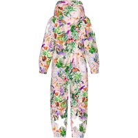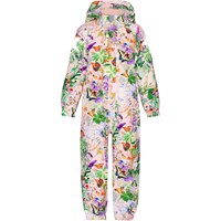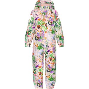 Rosa softshelldräkt tillverkad av återvunnen polyester med ett vackert mönster av ängsblommor och fjärilar. Dräkten är ofodrad och idealisk för övergångsperioder, där den skyddar mot vind och regn samtidigt som den ger mycket rörelsefrihet. Den har en avtagbar huva, dragkedja med hakskydd, resår i midjan för en bra passform samt reflexer på ärmar, ben och huva för ökad synlighet i trafiken.