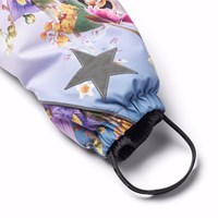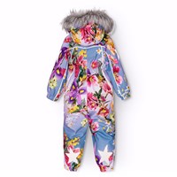 Overall i återvunnen polyester för en kall vinter med ett tryck av vackra blommor i fräscha färger på en bakgrund av blå och lila nyanser. Overallen har en avtagbar huva med fleecefoder, två dragkedjor med fleecefodrat hakskydd för att förhindra att huden fastnar. Overallen har en invändig överlappande flik och elastik i midjan, ärmsluten och bensluten för att hålla snö, regn och vind ute. Overallen har reflexer längs sidorna, runt huvan och stora stjärnformade reflexer på både ärmar och ben för att öka synligheten i trafiken. Overallen är fodrad med 3M™ Thinsulate™, vilket är lätt och ger större rörlighet för barnet.