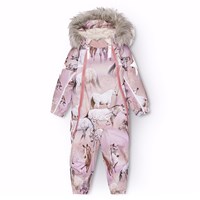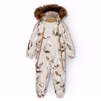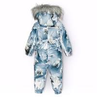 Overall i återvunnen polyester för en kall vinter med tryck av lekfulla isbjörnar bland isflak i nyanser av blått. Overallen har en avtagbar huva med fleece, två blixtlås med fleecefodrat hakskydd för att förhindra att huden fastnar. Den har en invändig överlappande flik och elastik i midjan, ärmslut och benslut för att hålla snö, regn och vind ute. Overallen har reflexer längs sidorna, runt huven och stora stjärnformade reflexer på både ärmar och ben för att öka synligheten i trafiken. Overallen är fodrad med 3M™ Thinsulate™, vilket är lättviktigt och ger större rörelsefrihet för barnet.