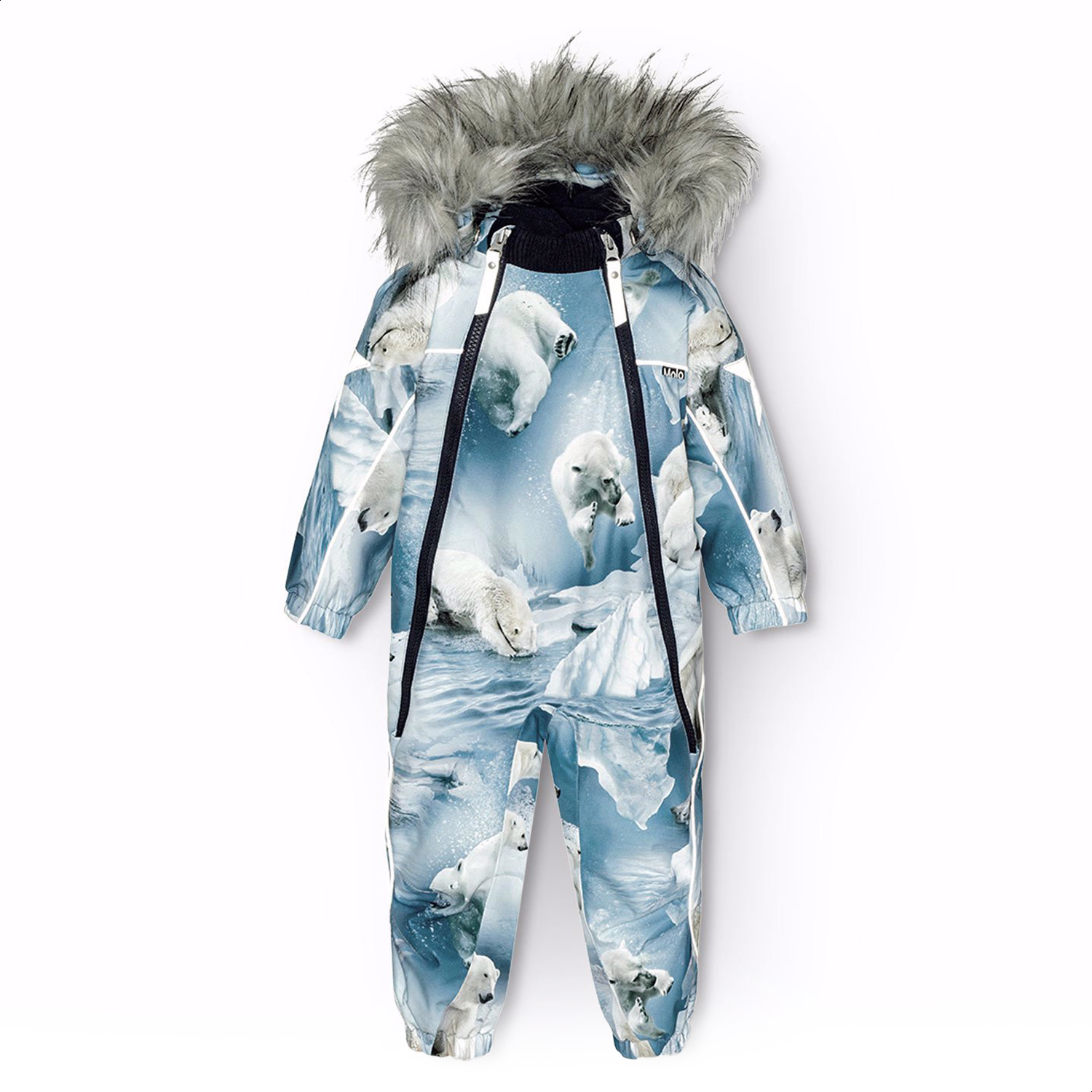Overall i återvunnen polyester för en kall vinter med tryck av lekfulla isbjörnar bland isflak i nyanser av blått. Overallen har en avtagbar huva med fleece, två blixtlås med fleecefodrat hakskydd för att förhindra att huden fastnar. Den har en invändig överlappande flik och elastik i midjan, ärmslut och benslut för att hålla snö, regn och vind ute. Overallen har reflexer längs sidorna, runt huven och stora stjärnformade reflexer på både ärmar och ben för att öka synligheten i trafiken. Overallen är fodrad med 3M™ Thinsulate™, vilket är lättviktigt och ger större rörelsefrihet för barnet.