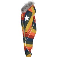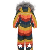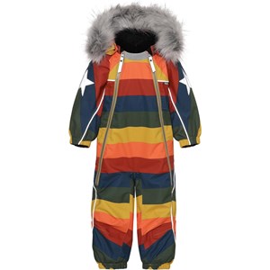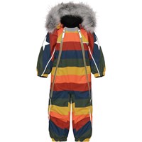 Pyxis är en funktionell overall till baby och små barn i regnbågsfärg. Overallen har avtagbar huva med fuskpälskant, två sneda dragkedjor fram som gör den lätt att ta av och på, snöskydd vid benslut, gummiband under fötterna och Molos välkända reflexstjärna på ärmar och baktill på benen. Overallen är vin- och vattentät, andas och har tejpade sömmar. Foder och innermaterial är återvunnet, tillverkat av återvunnen polyester. Denna produkt har en PFC- fri impregnering (innehåller t.ex. inte PFOS, PFOA och liknande). Vattenpelare och andningsförmågan är ytterligt förbättrad och är nu helt uppe i 15.000mm i vattenpelare och andningsförmågan på 15.000 g/m2/24t.