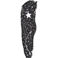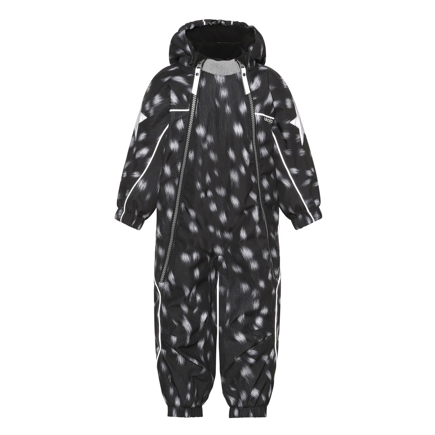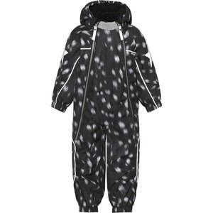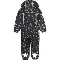 Pyxis är en funktionell overall till baby och små barn i svart med vita fläckar, som liknar hjortpäls. Overallen har avtagbar huva, två sneda dragkedjor fram som gör den lätt att ta av och på, snöskydd vid benslut, gummiband under fötterna och Molos välkända reflexstjärna på ärmar och baktill på benen. Overallen är vin- och vattentät, andas och har tejpade sömmar. Foder och innermaterial är återvunnet, tillverkat av återvunnen polyester. Denna produkt har en PFC- fri impregnering (innehåller t.ex. inte PFOS, PFOA och liknande). Vattenpelare och andningsförmågan är ytterligt förbättrad och är nu helt uppe i 15.000mm i vattenpelare och andningsförmågan på 15.000 g/m2/24t.